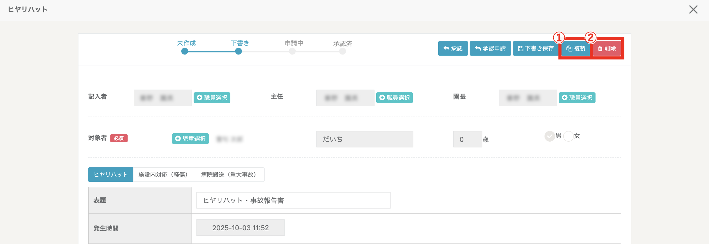 ➀『複製』をクリックすると、同じ複製されたヒヤリハット・事故報告書の編集画面になります。