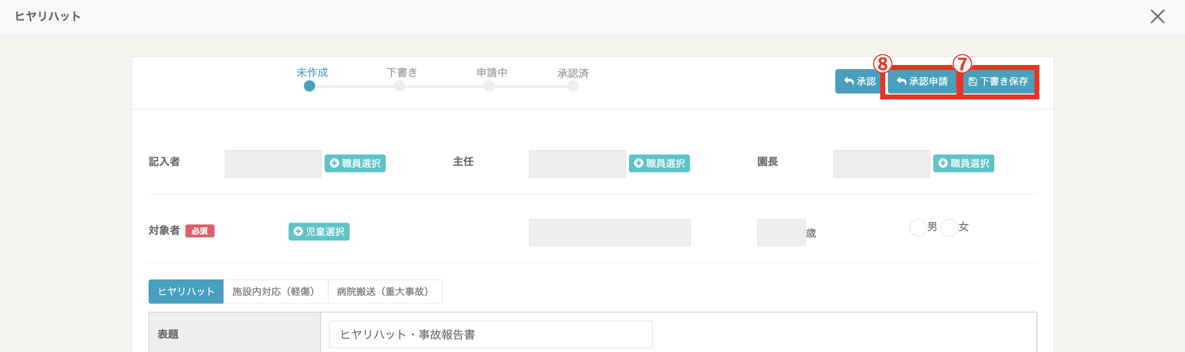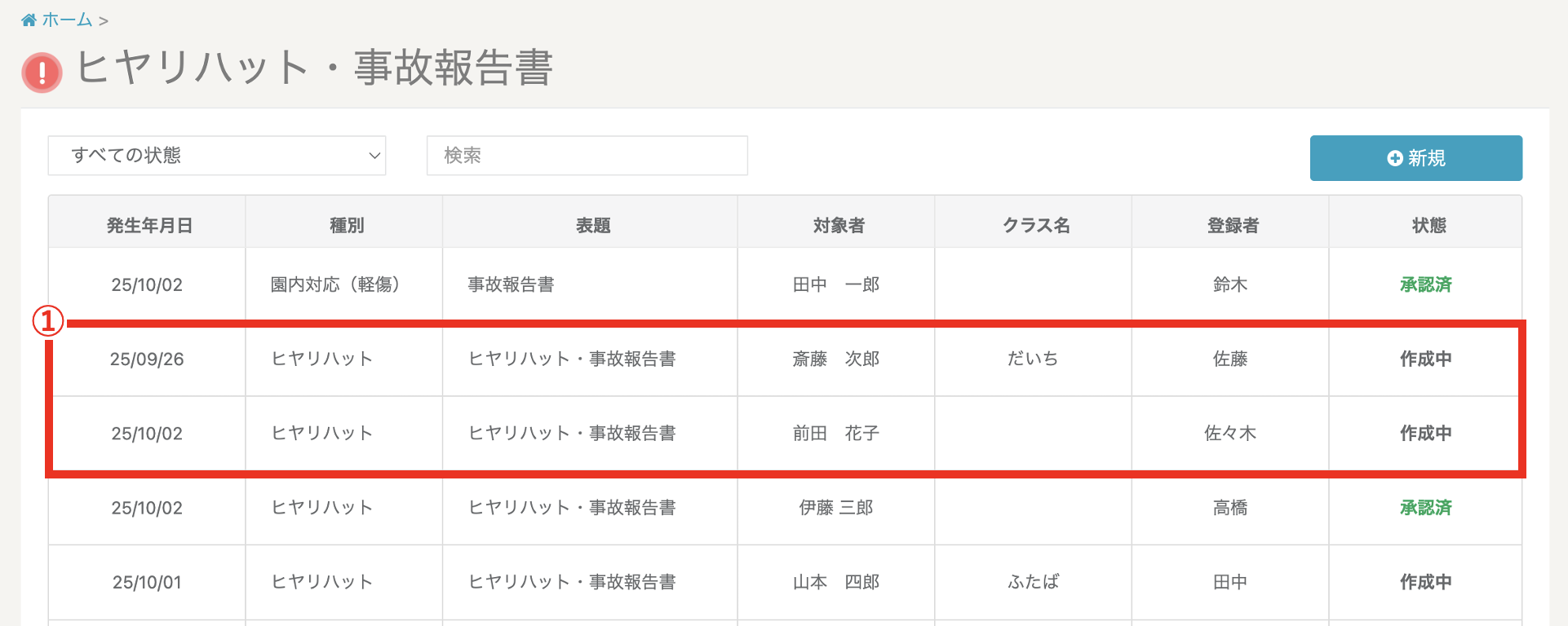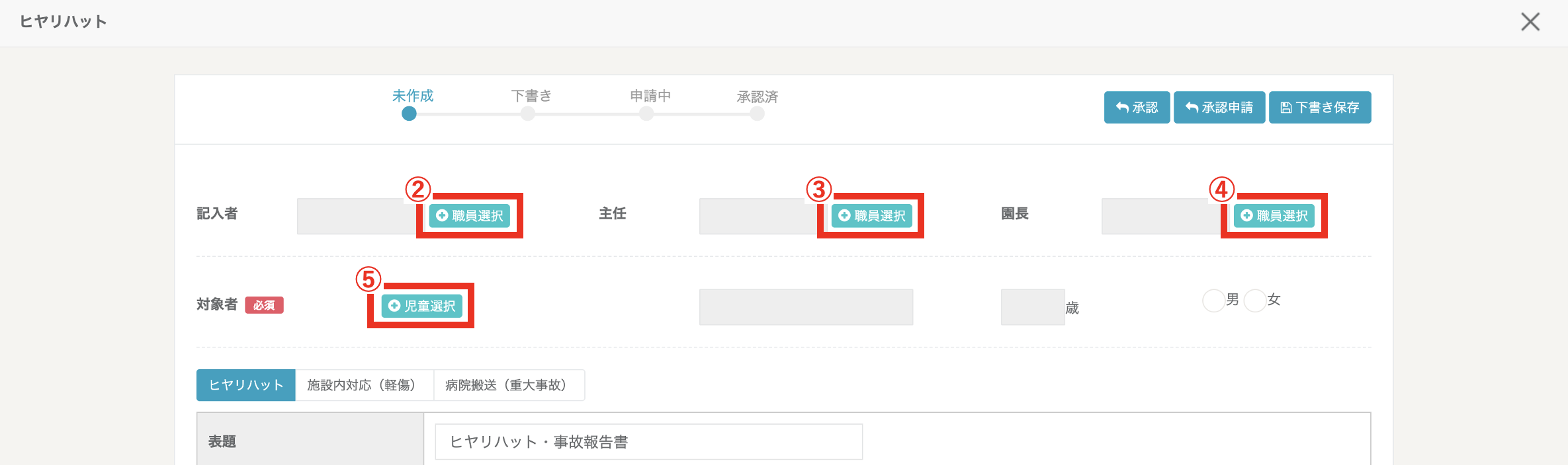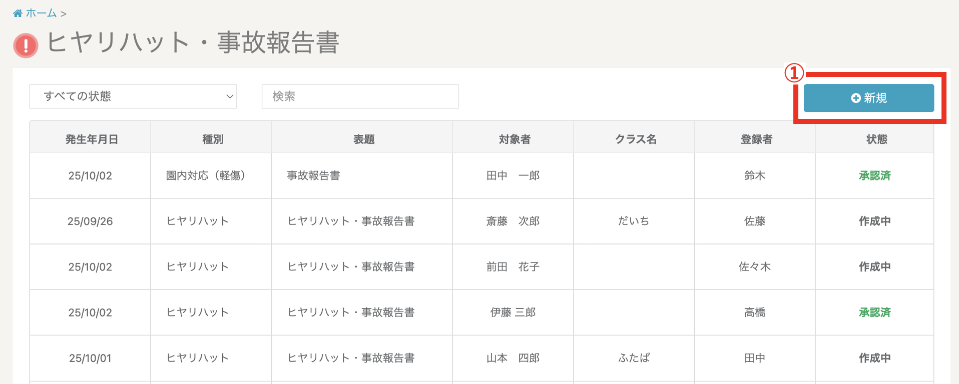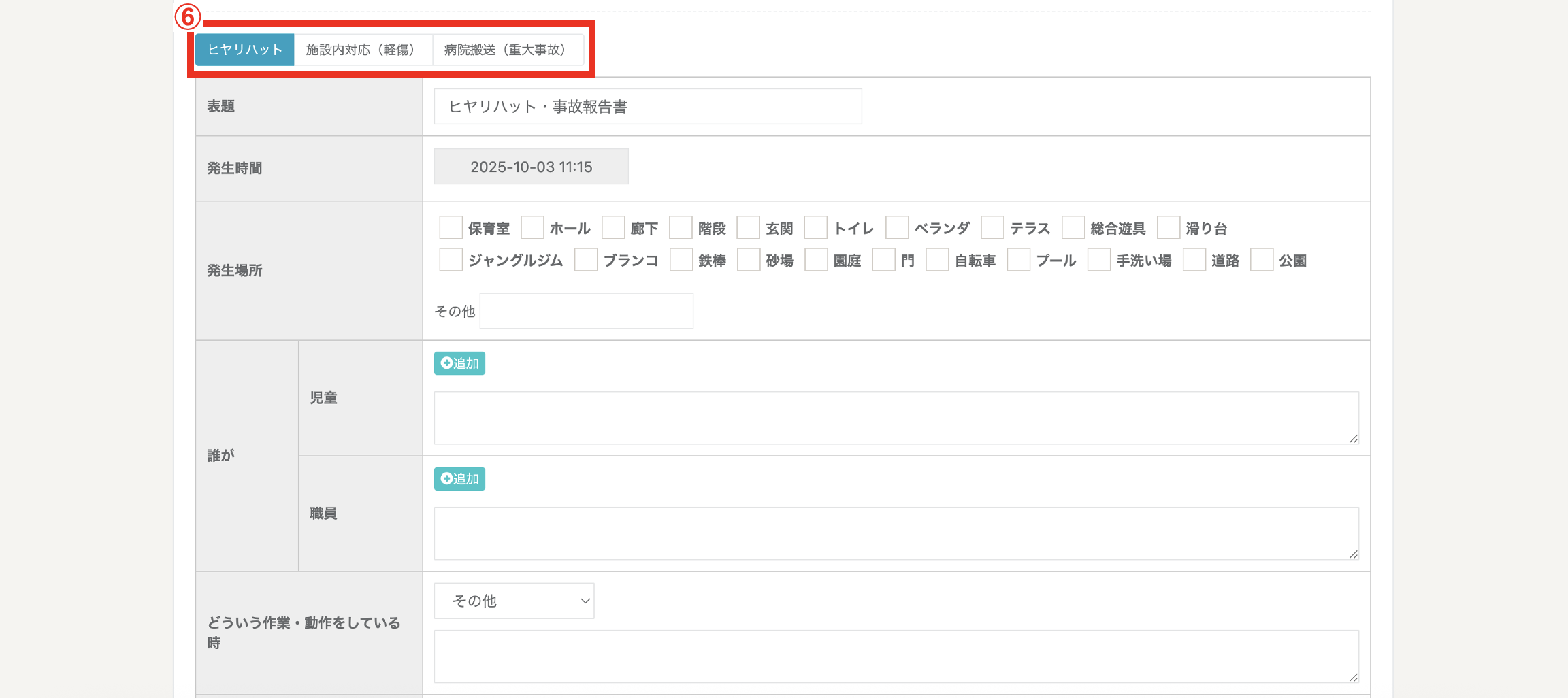 この機能は、園内で発生した「ヒヤリハット」や「施設内対応(軽傷)」、または「病院搬送(重大事故)」に関する情報を統一された形式で記録・報告・共有するための機能です。