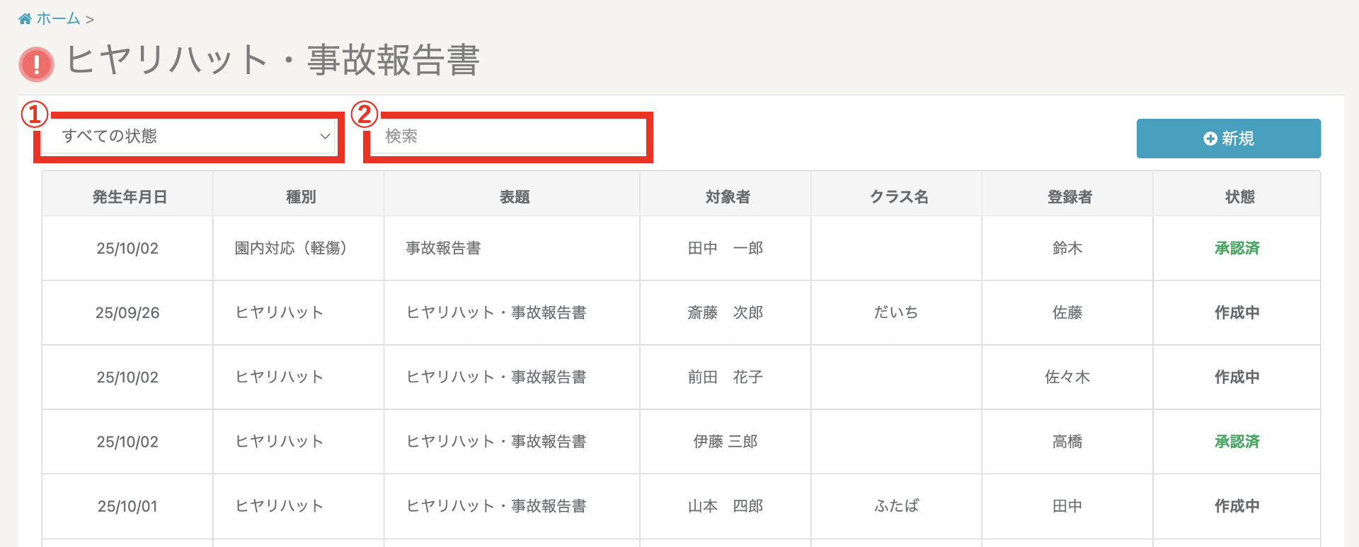 ➁内容の一部を入力し該当するヒヤリハット・事故報告書を検索して、表示を絞り込むことができます。検索対象は表題・対象者・クラス名・登録者になります。