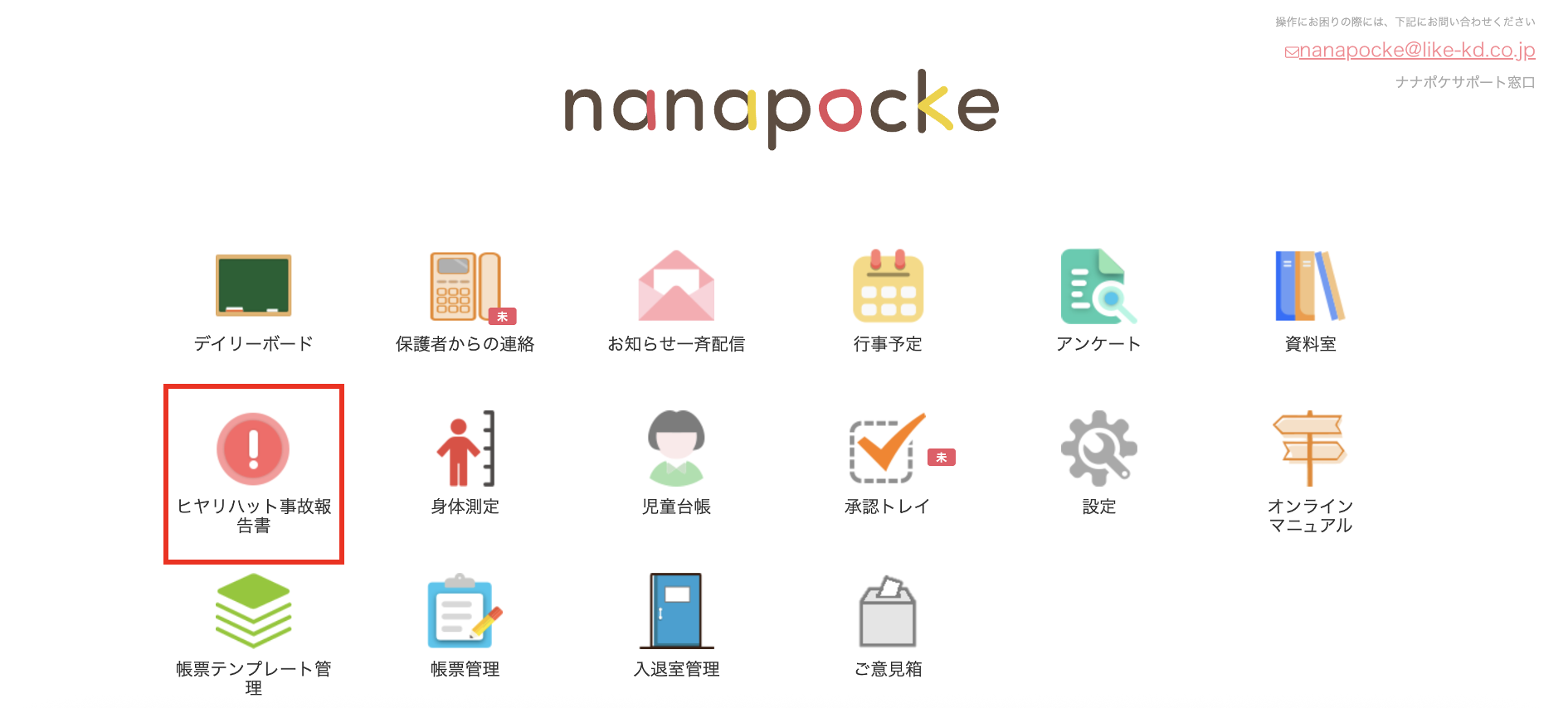 ダッシュボードから『ヒヤリハット事故報告書』をクリックします。
