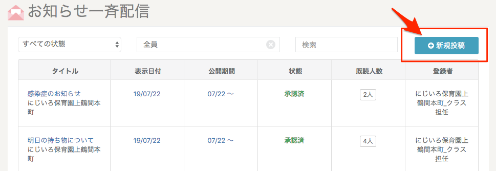 「お知らせ一斉配信」から「新規作成」ボタンを選択する