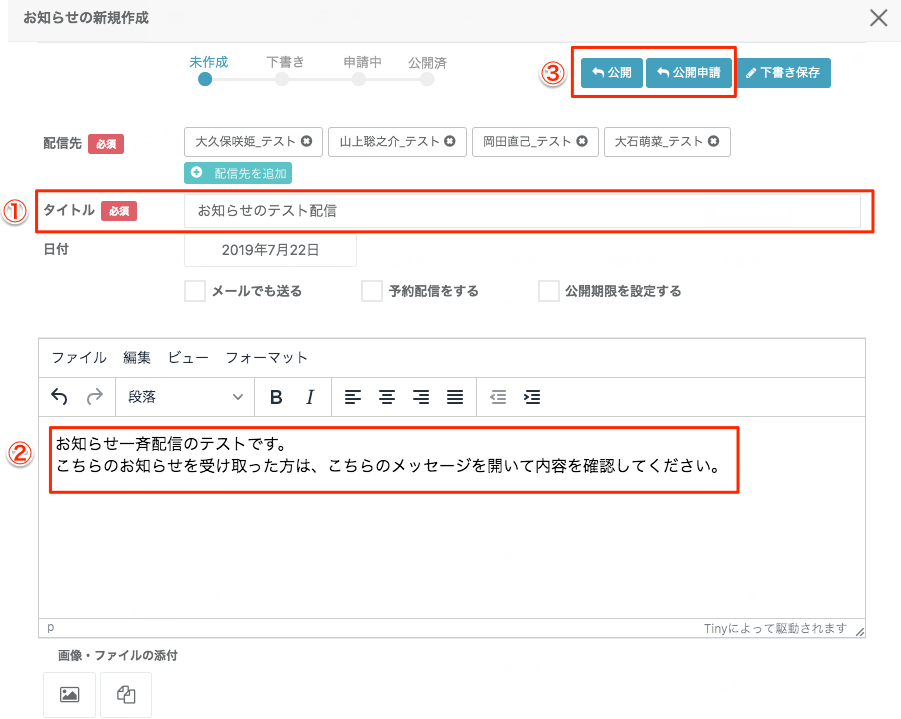 ③ 公開または、公開申請ボタンを選択し、配信を行う。