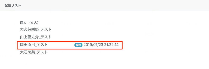 お知らせ一斉配信画面を表示させ、配信したお知らせの「既読人数」枠の数字部分を選択し、「配信リスト」を表示させる。