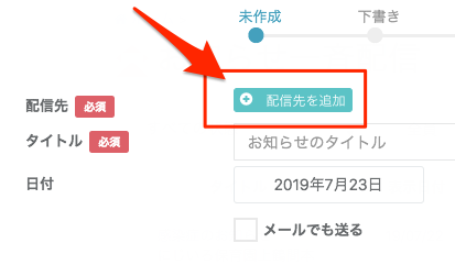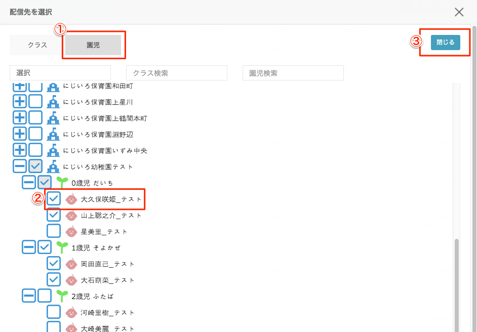 配信先にある、「配信先を追加」ボタンを設定し対象の園児を選択する。