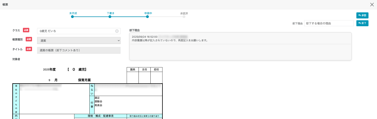 書類の種別が「帳票」の場合、却下時に「却下理由」を入力することができます。