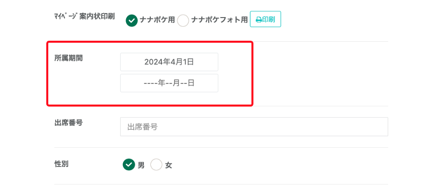 退園後も保護者がナナポケを閲覧できるようにするには、「マイページ使用期限」に日付を入力します。