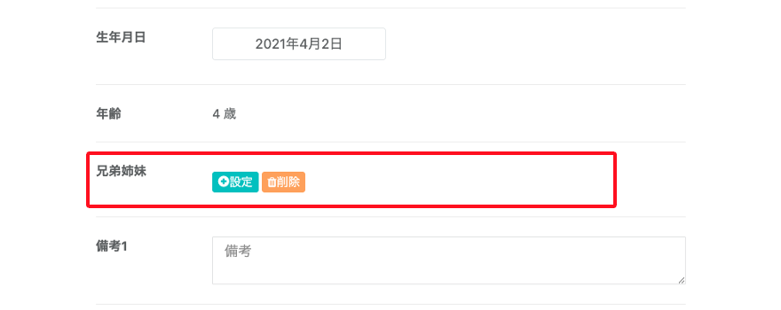 児童の設定画面より、「兄弟姉妹」項目の設定ボタンを選択する