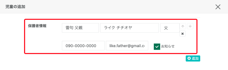 項目:ご家族名、児童との関係、電話番号、メールアドレス、お知らせをメールで受信するかの設定