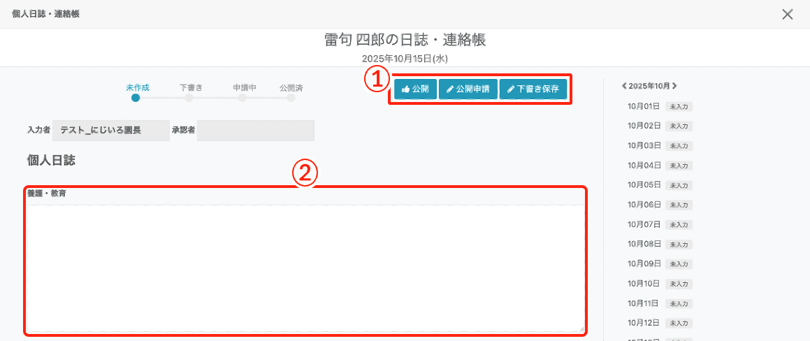 ①内容を保護者へ公開/内容を上長へ公開申請する/内容を一時保存するかを選択できます。公開後には、 ボタンとボタンが表示されます。