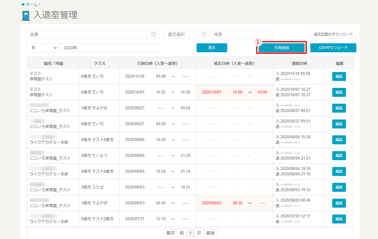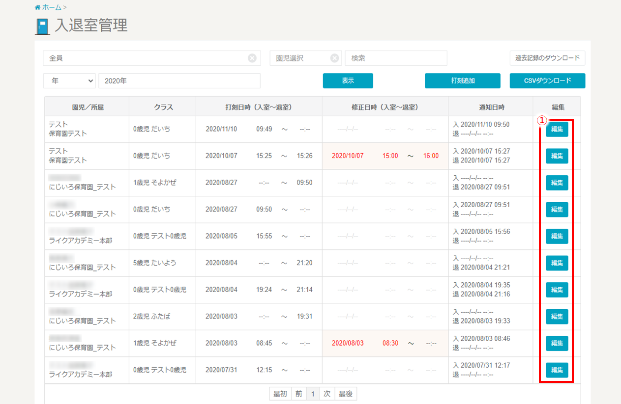 ➀入退室一覧から、編集したい園児を探し、『編集』をクリックします。