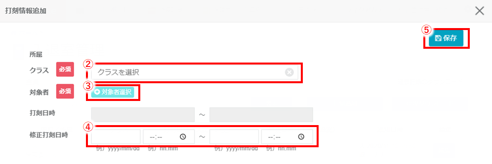 ➀入退室一覧から、『打刻追加』をクリックします。