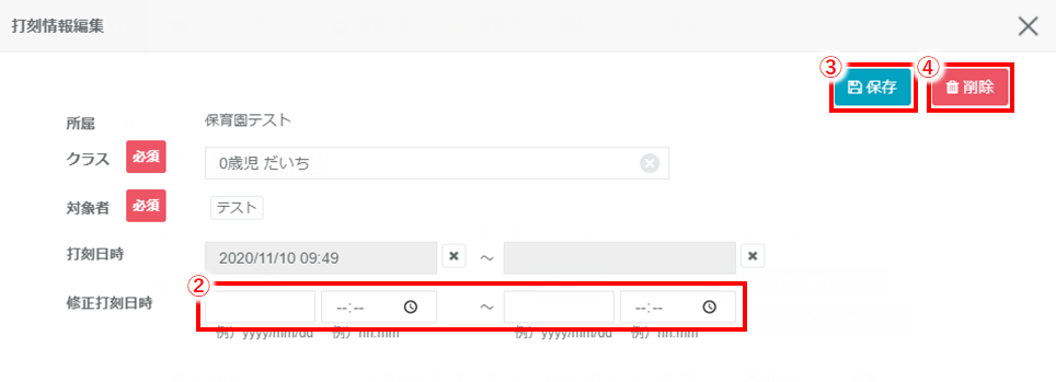 入退室打刻で、園児の入退室を登録し忘れたときに使用します。ただし、「入室」、「退室」どちらか一方でも登録されている時は、「入退室時刻の修正」で対応してください。