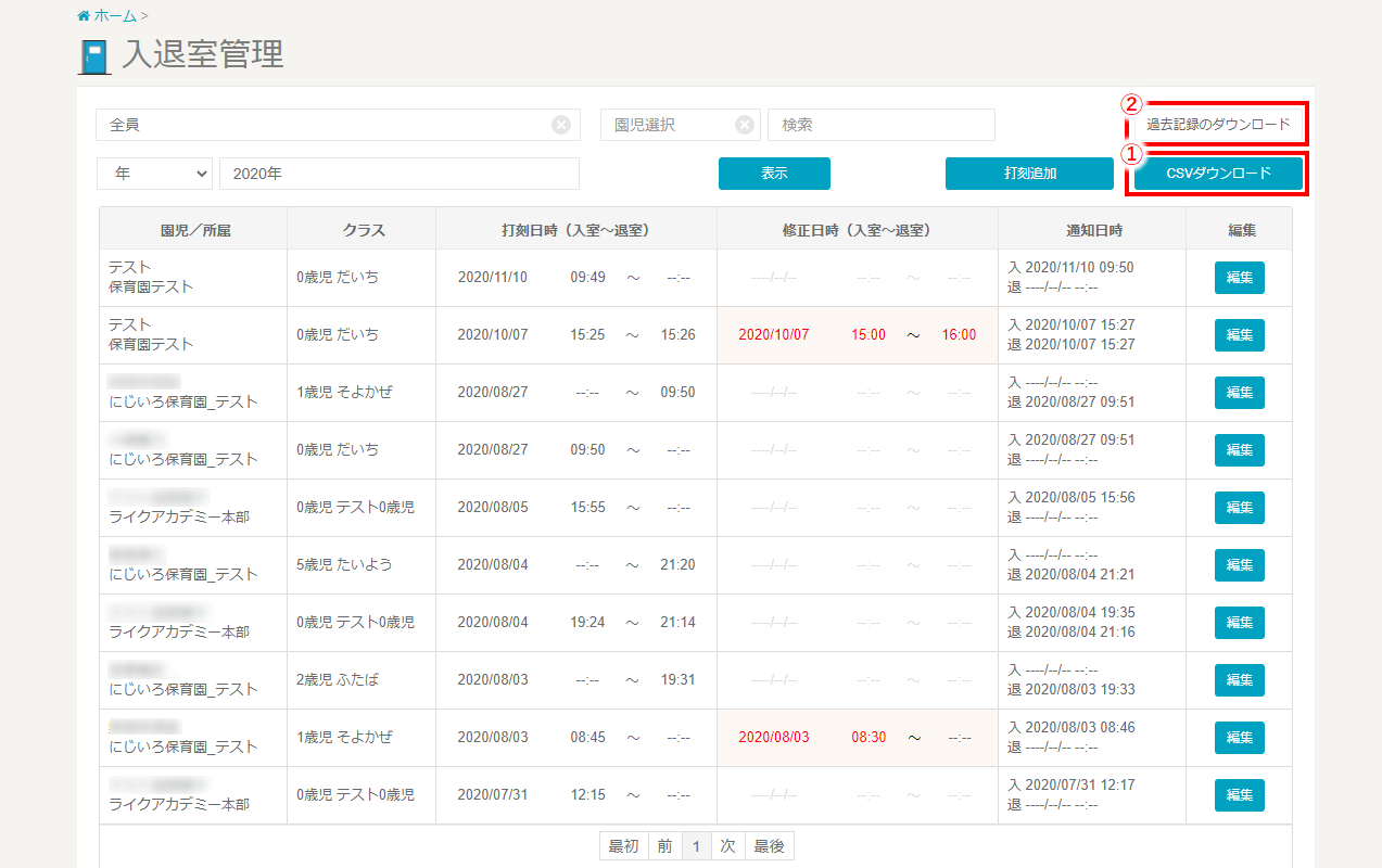 ➀『CSVダウンロード』をクリックすると、入退室一覧で表示されている園児のデータを、お使いのパソコンにCSVでダウンロードすることができます。保存先を指定して保存してください。