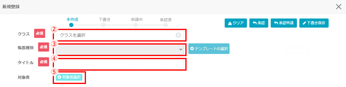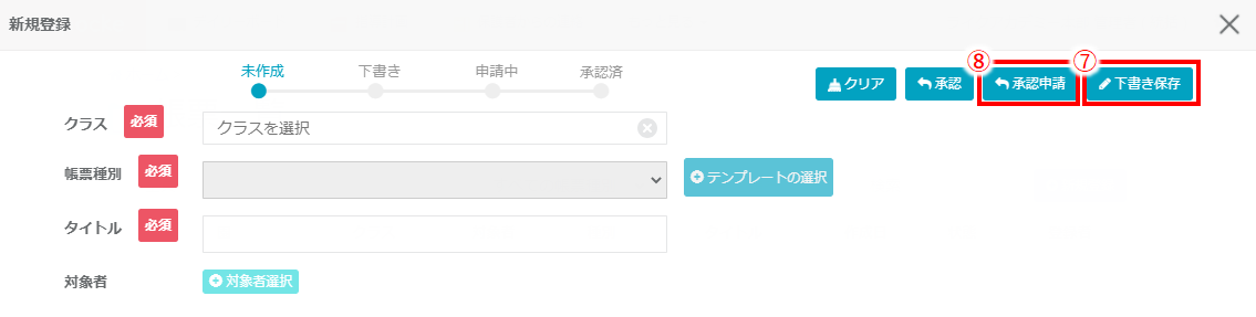 作成した帳票は、上長への承認申請を行ったり、下書き保存、複製が可能です。