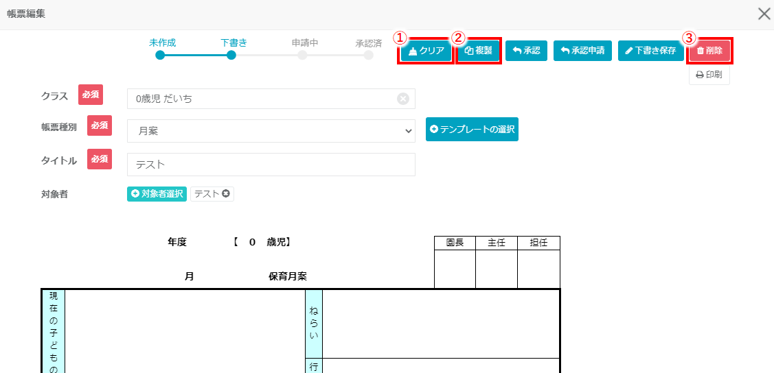 ➀帳票編集の画面で、『クリア』をクリックすると、記入されている帳票の内容をすべて消去することができます。タイトルは削除されないので注意してください。なお作成中の状態の帳票でのみ表示され操作することができます。