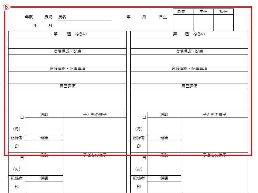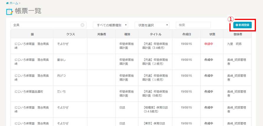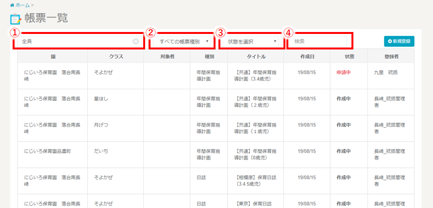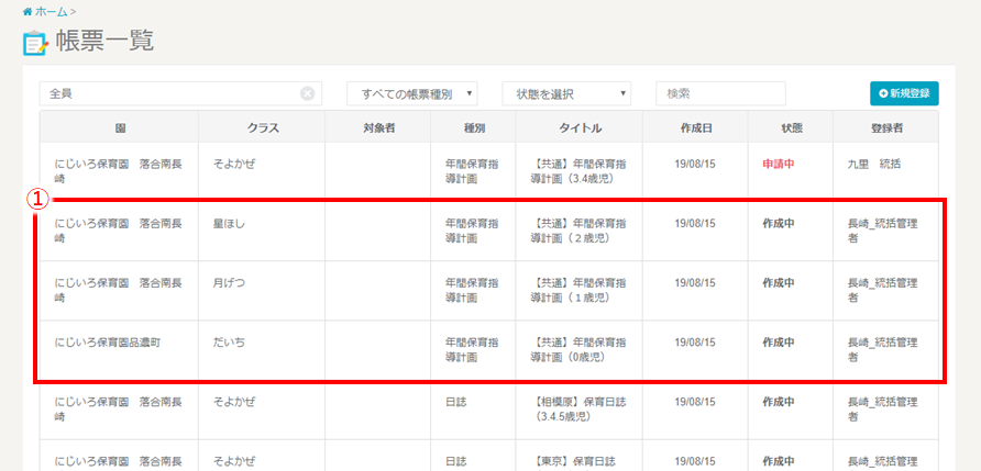 ➀園とクラスをプルダウンから選択して、表示する帳票を絞り込むことができます。