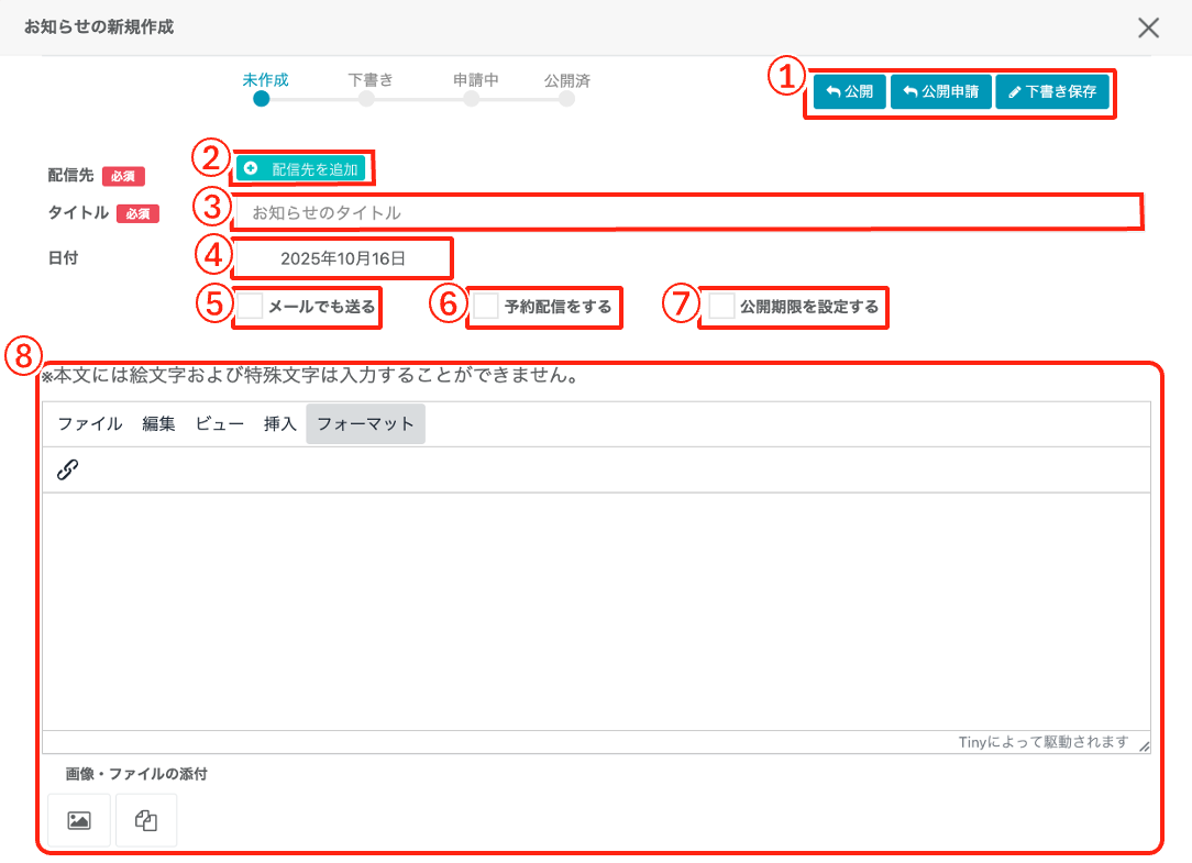 ①お知らせの公開/公開申請/下書き保存を選択できます。
