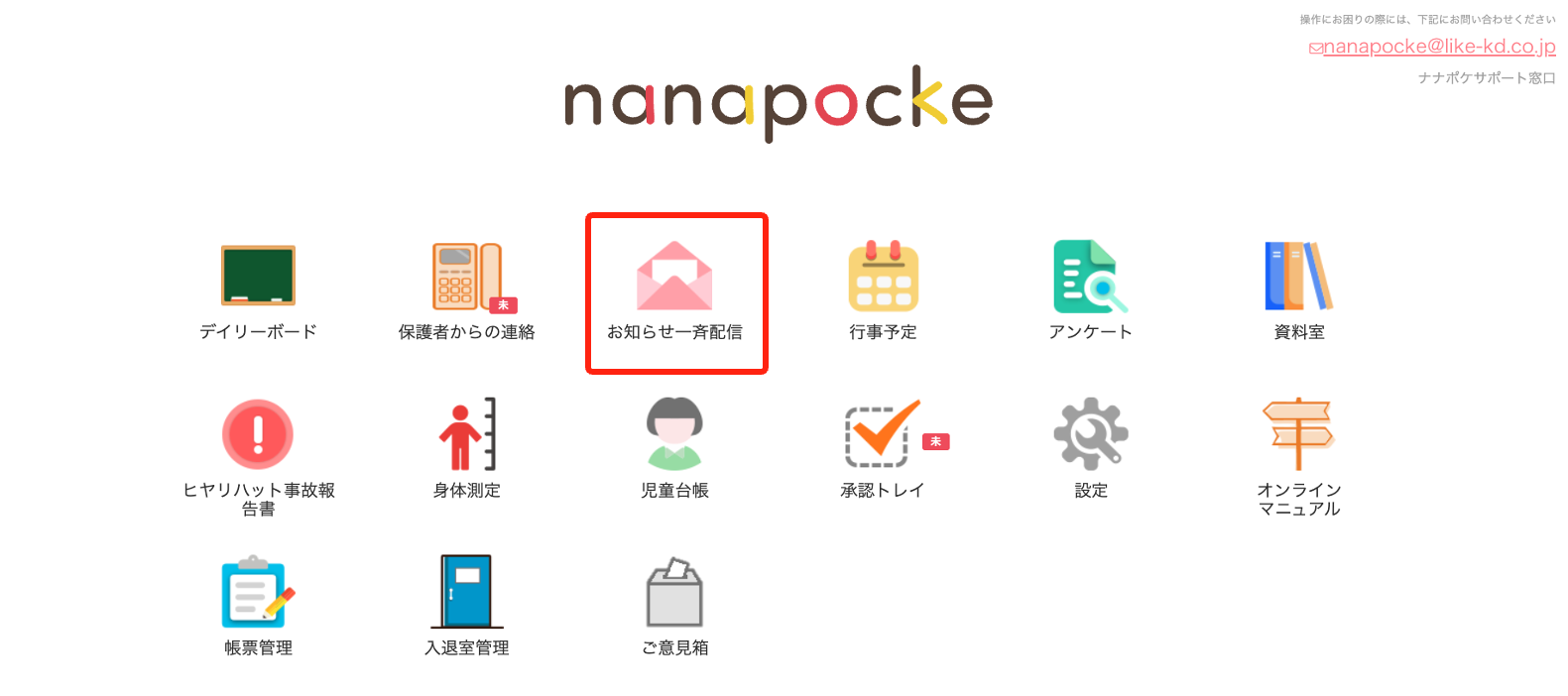 ダッシュボードから『お知らせ一斉配信』をクリックします。