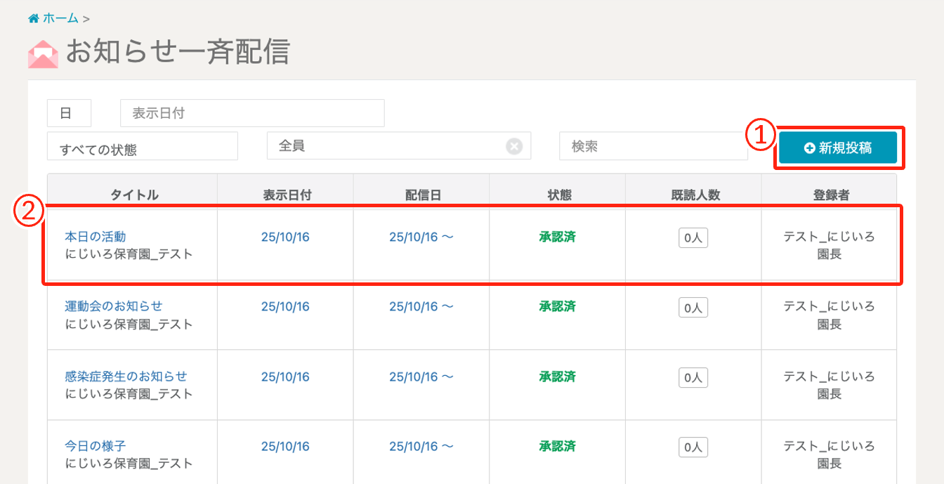 表示された配信リストには、配信された児童と、既読の場合には名前の右側に既読アイコンとお知らせを開いた日時が表示されます。