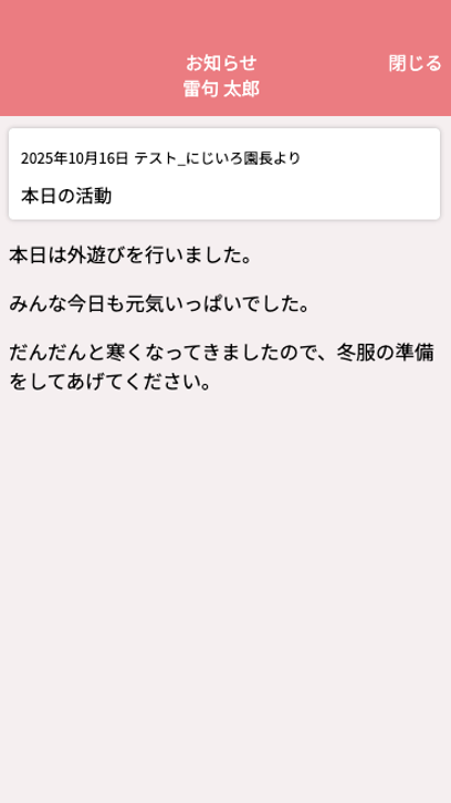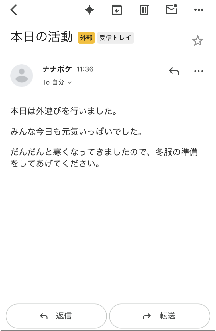 保護者がメールアドレスを登録していて、園で「メールでも送る」にチェックを入れている場合は、保護者にメールでも配信されます。