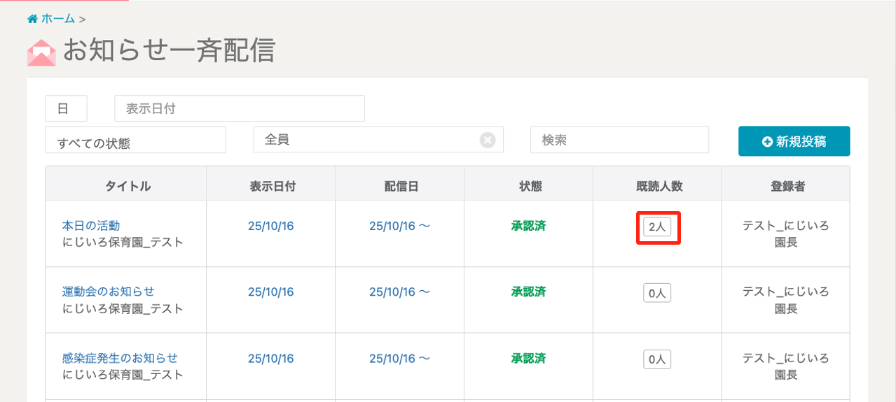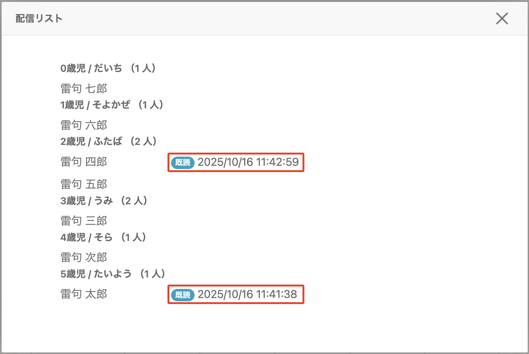 表示された配信リストには、配信された児童と、既読の場合には名前の右側に既読アイコンとお知らせを開いた日時が表示されます。