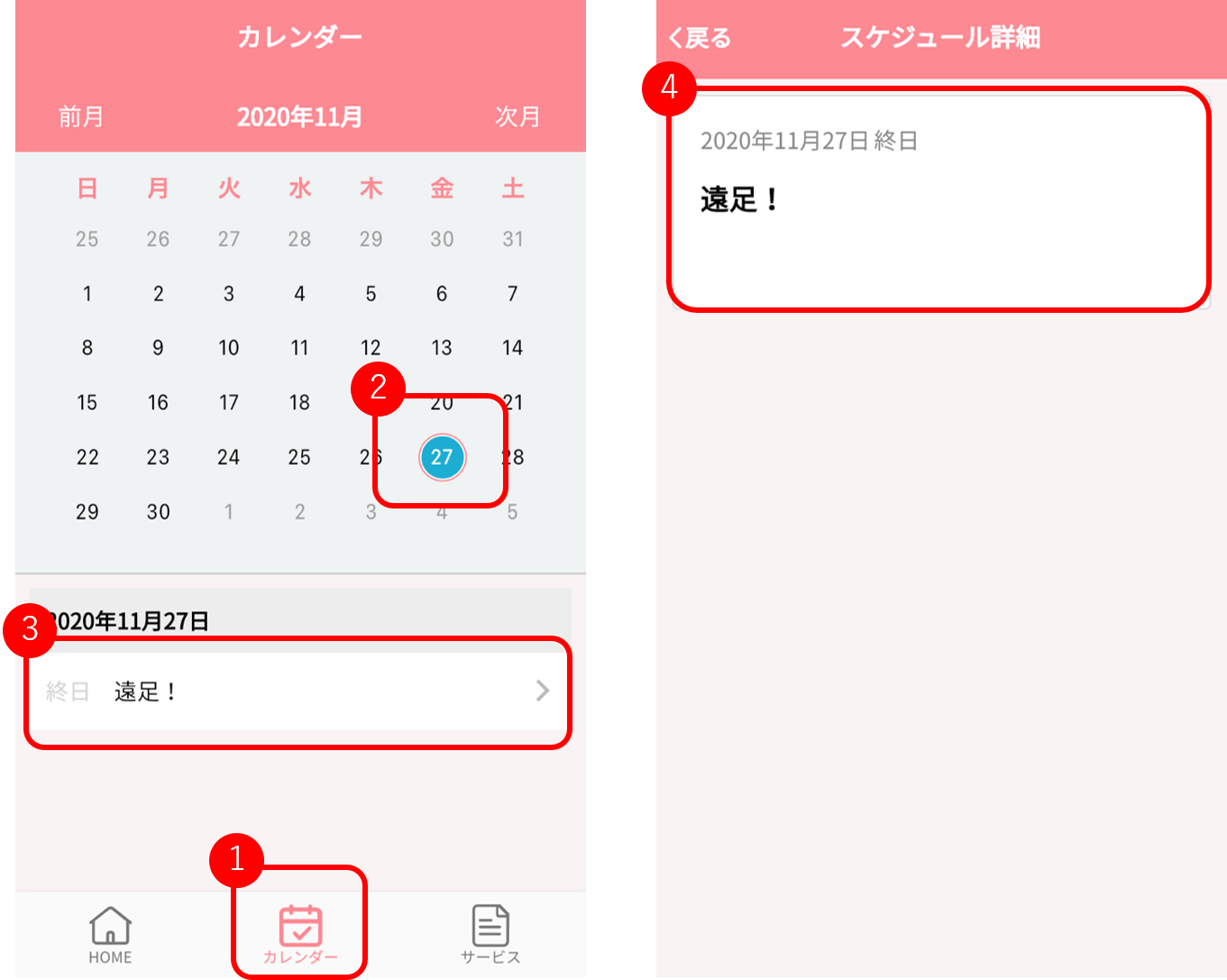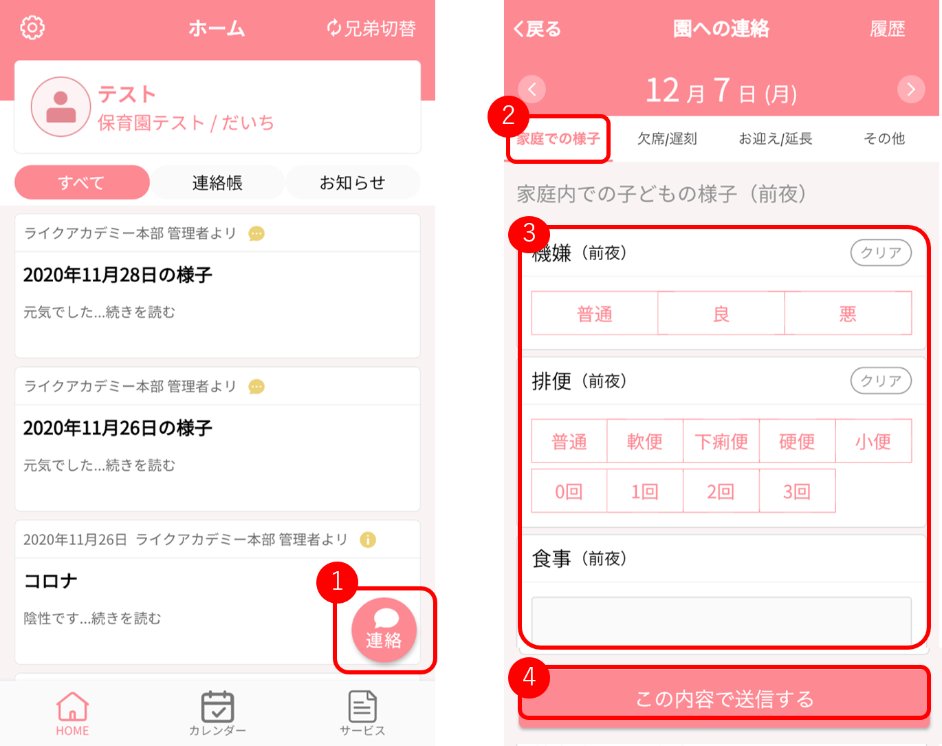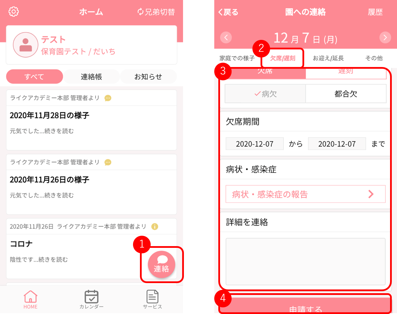 ④上記全て入力完了したら「申請する」ボタンを選択すると、園へ連絡されます。