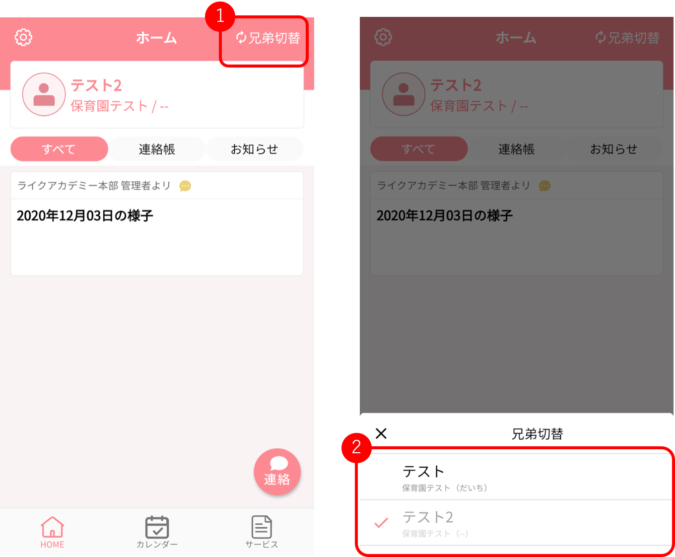 また、兄弟姉妹が同じ園に所属している児童の場合、アプリ上から「兄弟切替」を行うことで、兄弟姉妹すべての通知を受け取ることが可能になります。
