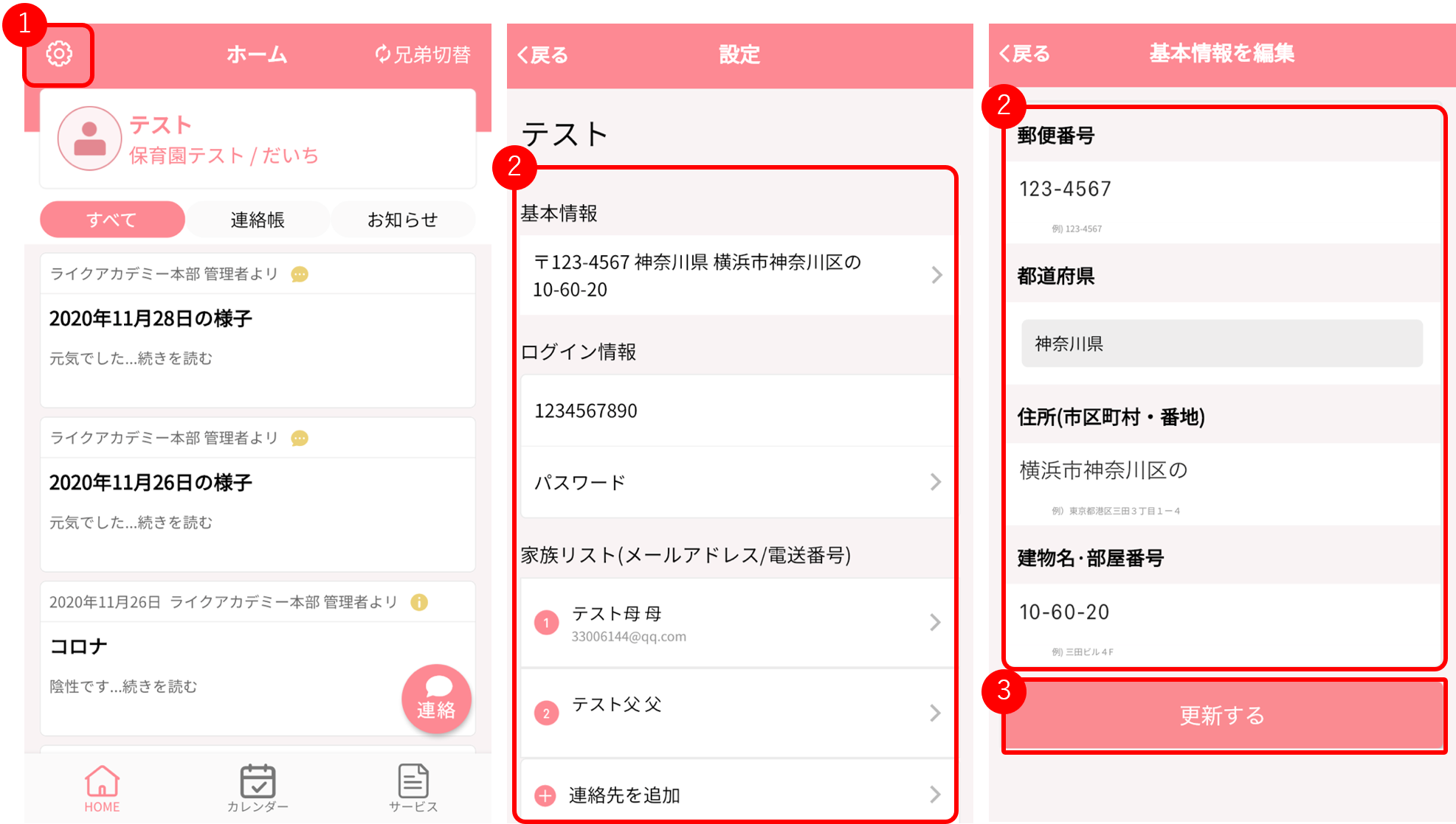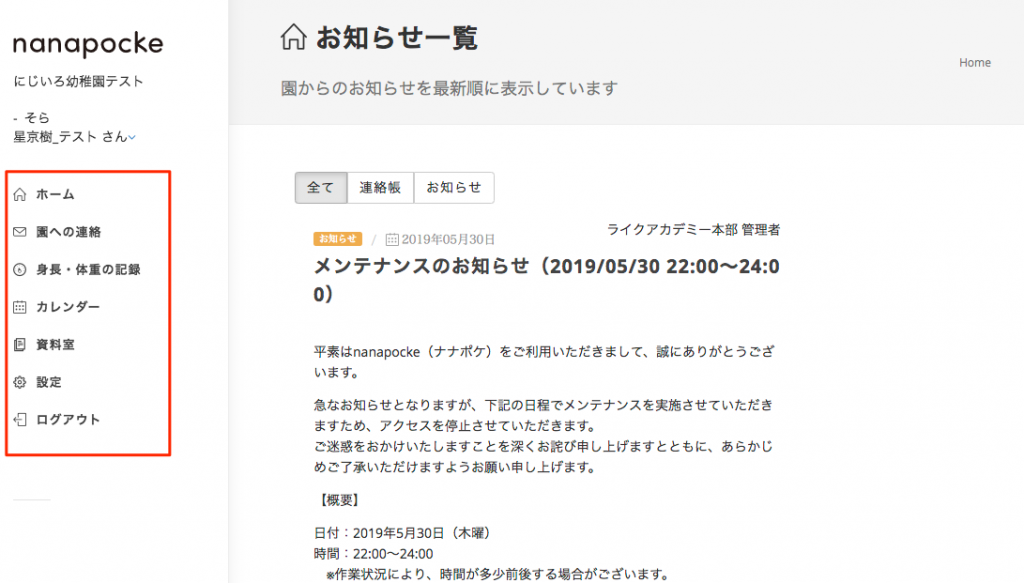 HOME画面では、園から配信されるお知らせや連絡帳の一覧画面が表示されます。