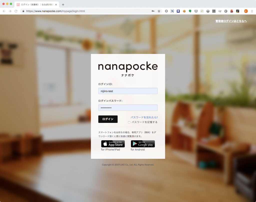 園から配布される、ログイン情報を元にログインIDとログインパスワードを入力してログインボタンを選択してください。