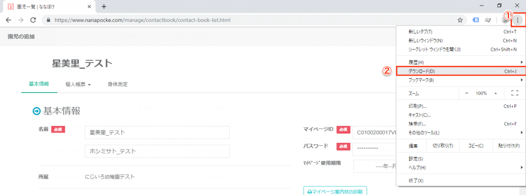 ※保護者アカウントのログイン情報は、「児童台帳」>「マイページ案内状の印刷」ボタンを選択すると、表示される案内状に記載されています。