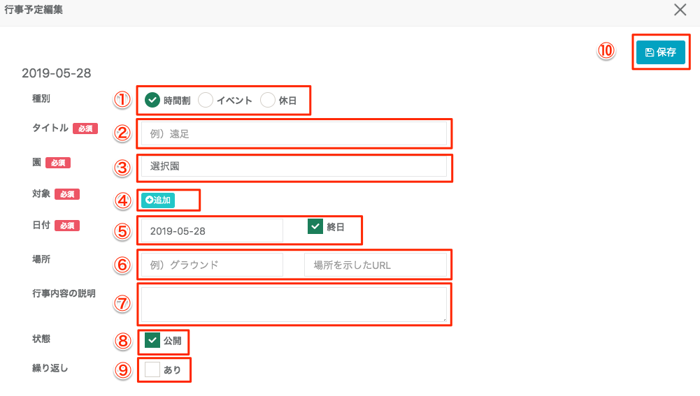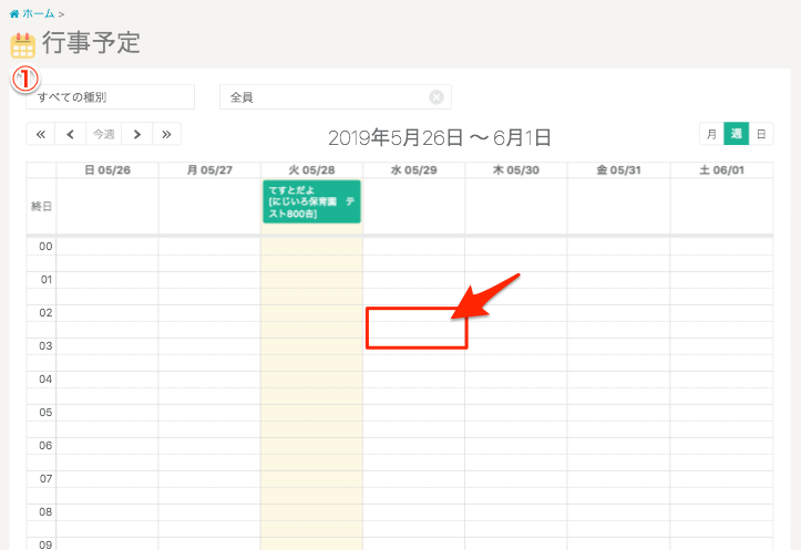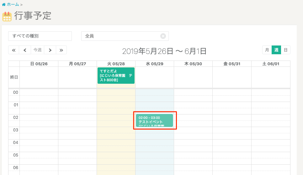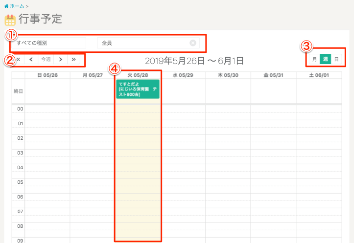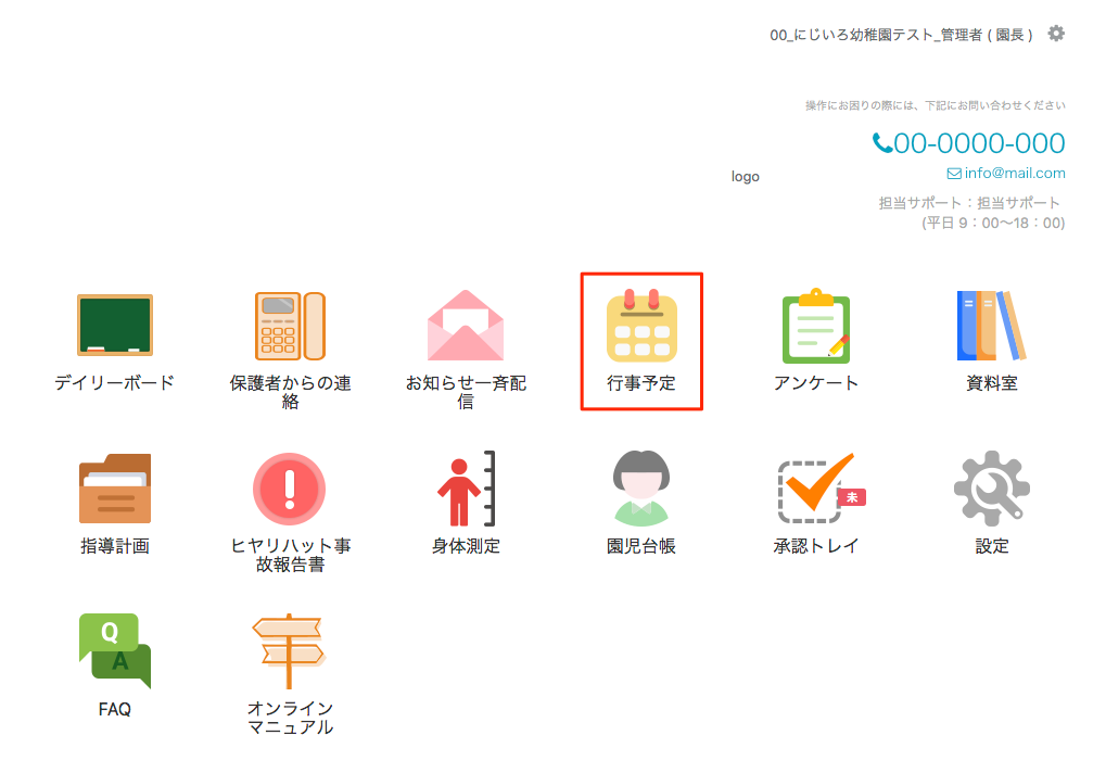 「行事予定」では、「職員間での情報共有」や「保護者へ行事等」を公開することができます。